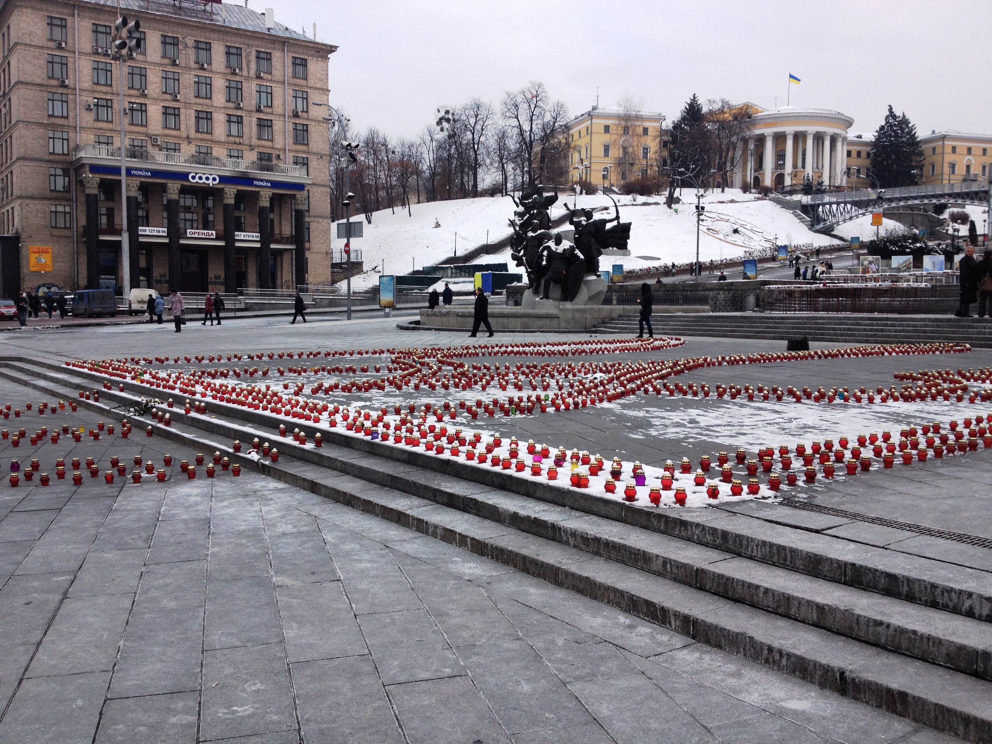 Группа людей скопившихся возле стенда внимательно рассматривают фотографии. На улице -6С. Я погружаюсь в тяжелые воспоминания разглядывая фотографии. Трудно представить, что вся эта площадь пылала в огне и находилась под непрерывными автоматными обстрелами всего лишь год назад, что белым днем более 100 невинных людей были расстреляны как животные собственным правительством на площадях города.