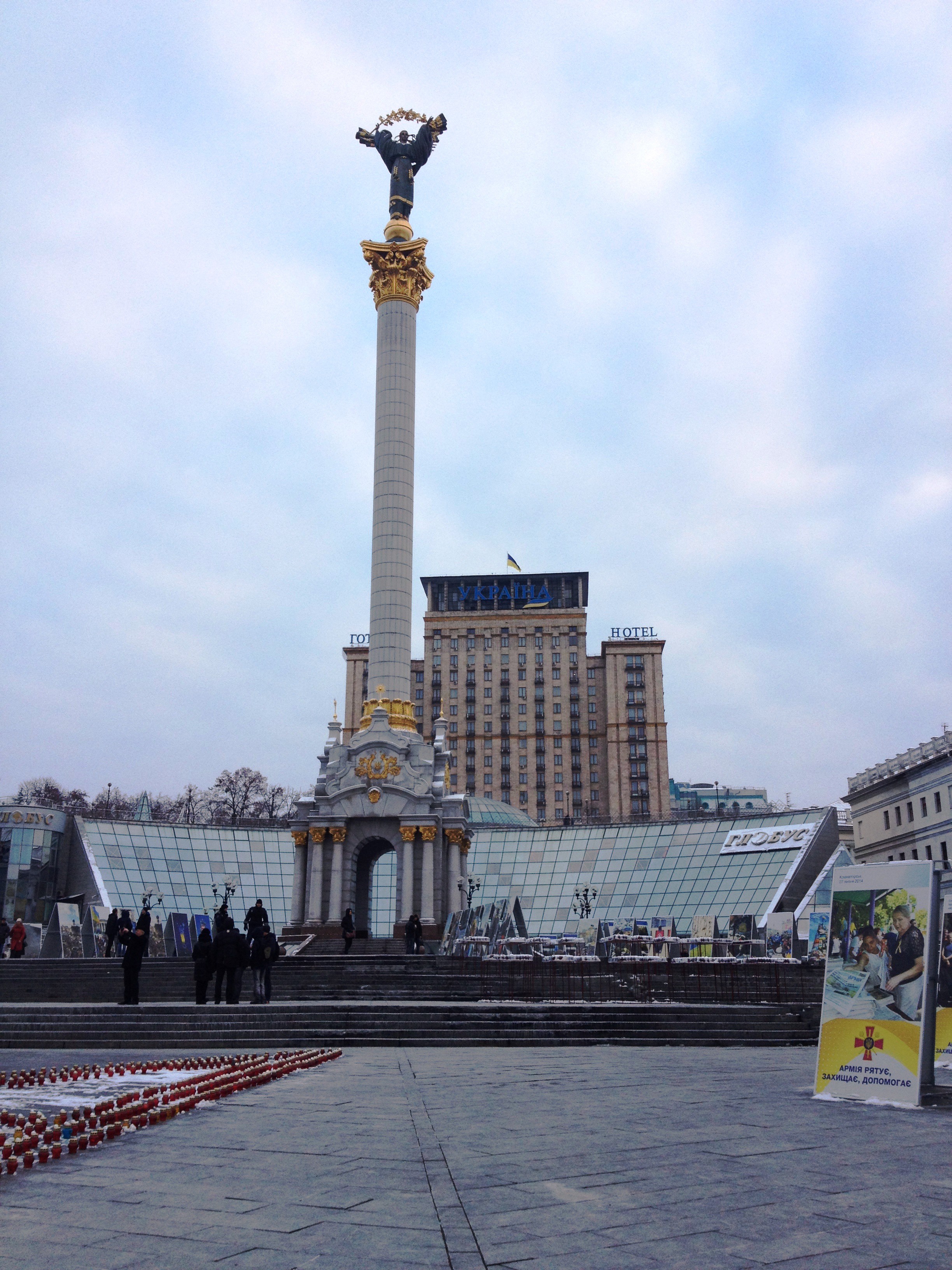Возле стенда стоит человек и списывает информацию об одном из пропавших к себе в блокнот. Наконец-то, хоть одного бандеровца встретила! Он, небось, один из тех кто похитил этих людей и наверное в каком-то подвале издевается над ними. С осторожкой стою неподалеку и жду пока он повернется чтобы увидеть лицо этого бездушного существа потерявшего все человеческие чувства. Вдруг он резко поворачивается и подходит прямо ко мне. Я теряю дар речи и мои подмерзшие ноги совершенно меня не слушаются. Уже совсем стемнело и людей вокруг почти нет. «Если вы хотите, я могу вас сфотографировать на фоне памятника независимости!» — его приветливый голос возвращает меня к реальности. На меня смотрит молодой человек с добрыми голубыми глазами, в кончиках которых блестят свежие капли слез. Его приветливость и ненаигранная сердечность застали меня врасплох… Как же так может быть? Этот человек явно не подходит под образ опасного бандеровца которого я ожидала увидеть и которого мне так долго рисовало российское ТВ. Я позволила ему меня сфотографировать. Фото вышло замечательное — моя желтая шапка с украинским гербом ярко выделялась на фоне темного ночного неба и стройной, высокой статуи Независимости. Да, она стоит… она не согнулась… не сломилась от тяжести войны, насилия, предательства и горя которое нахлынуло не нее в этом году. Наоборот, она кажется стала еще более стройной и высокой чем 1,5 года назад когда я ее видела в последний раз.