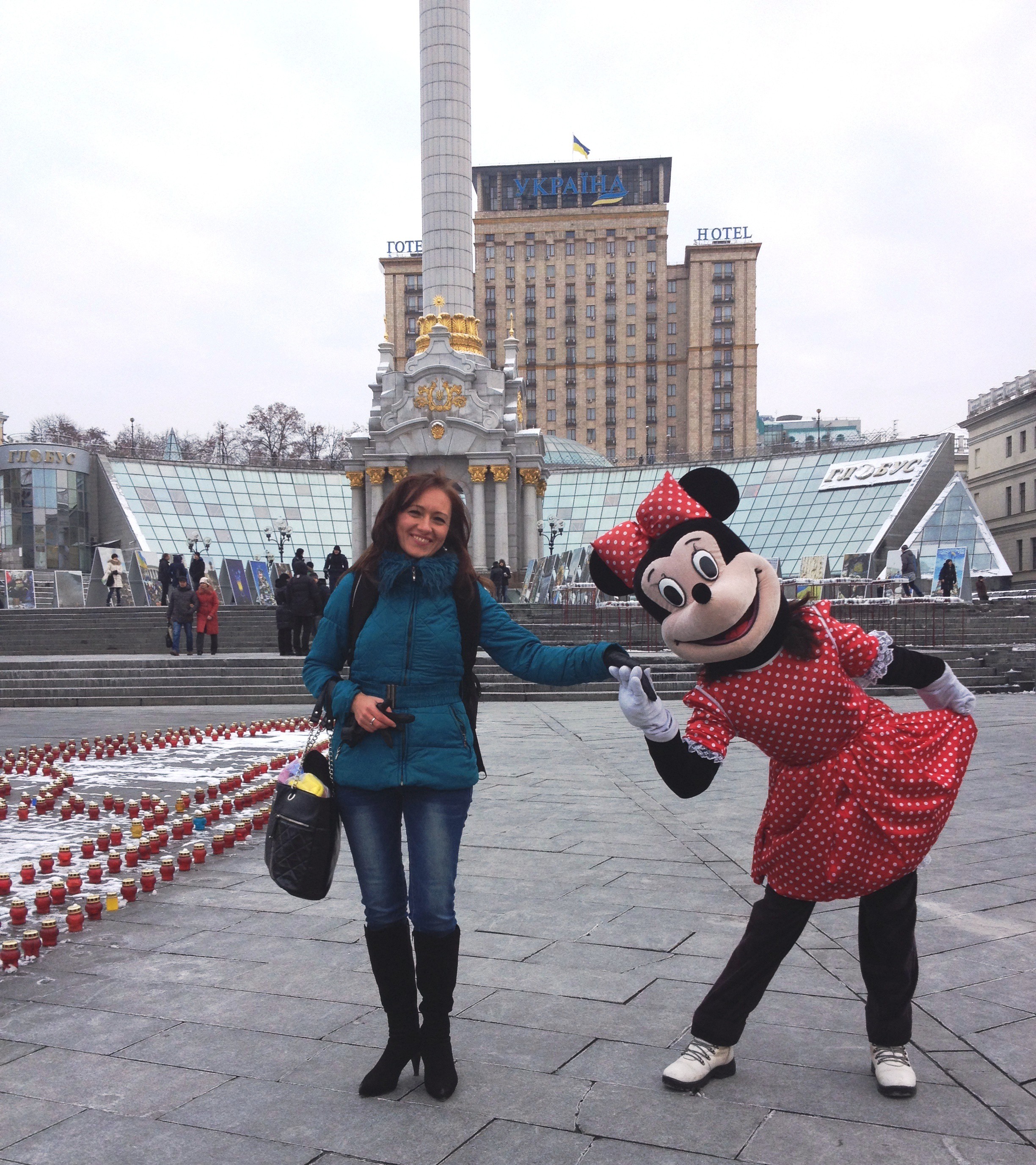 Мысль пронеслась, «наверное отвод внимания для того чтобы застать свои жертвы врасплох…». С насторожкой иду дальше. Вдруг кто-то хватает меня сзади за плечо. Вздрагиваю… Крик о помощи застыл у меня в горле, и только столб белого пара вырвался из груди тяжело пробиваясь сквозь толщу морозного Киевского воздуха выдавая мое быстрое сердцебиение. Неужели вот так наступит мой конец?! Я оглянулась с замороженным ужасом на лице. На меня смотрит нечеловеческое существо с застывшей черной улыбкой и в кровяной одежде в крапочку по всему телу. Следующие секунды казалось длились вечность. Когда наконец рассудок вернулся ко мне, кровь снова хлынула мне в голову и глаза сумели сфокусироваться. Это существо представившись Мики-Маусом мило поцеловало мне руку, затем проговорило тонким доброжелательным голоском, «Добро пожаловать в Киев»! «Вот таки да…», думаю. «Что все это значит? Что за прикол придумали эти бандиты-бандеровцы? Наверное много уж крови на их руках, поэтому так сильно и маскируются».