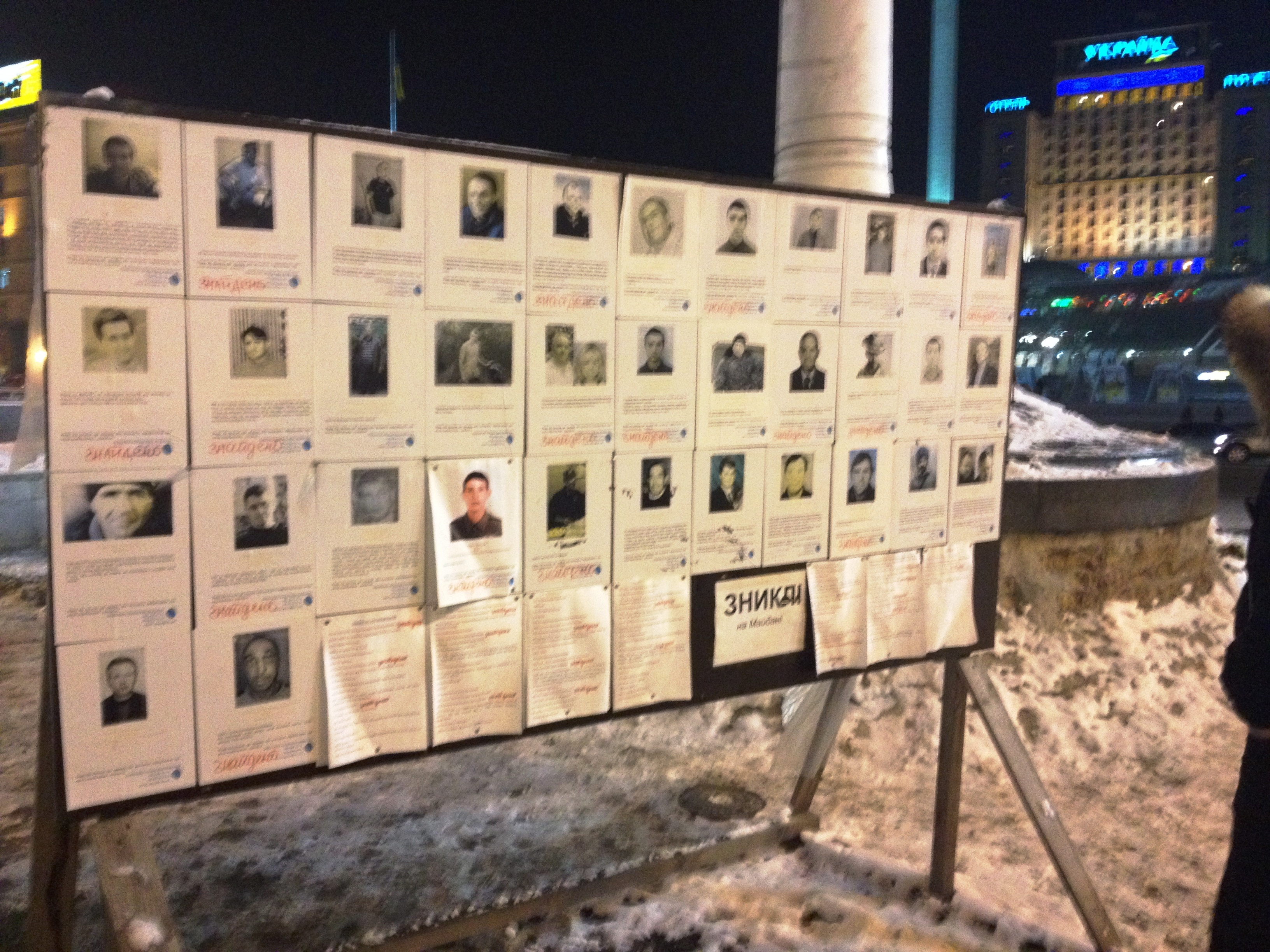 Бреду дальше. Вот стенды на противоположной части Майдана засыпанные снегом, а на них фото погибших или пропавших без вести людей во время революции — почти год назад. К счастью, на многих портретах крупными красными буквами написано «ЗНАЙШОВСЯ» (нашелся).